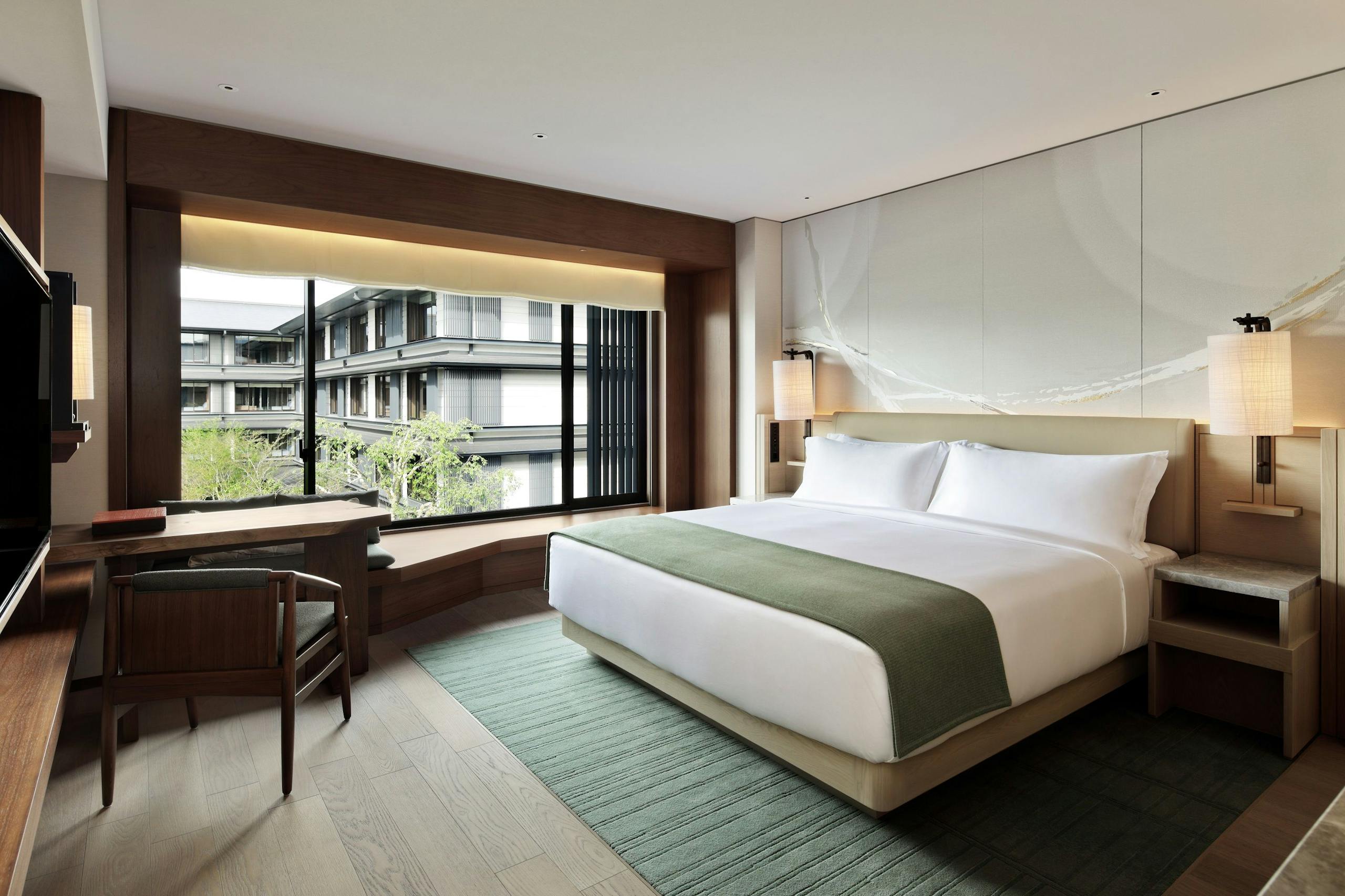 ザ・リッツ・カールトン京都は低層階の高級ホテルですが、鴨川ビューの客室は窓が大きく設計されており、景色を楽しめるデザインになっています。