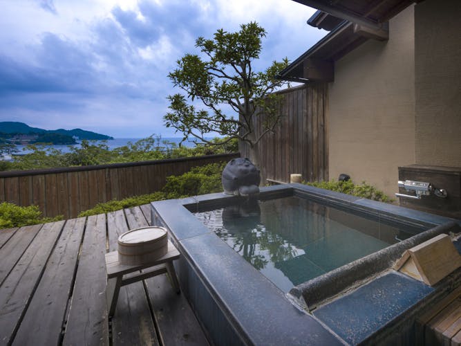 土肥市街地のやや高台にある離れの高級温泉宿で駿河湾を遠くに望むことができます。